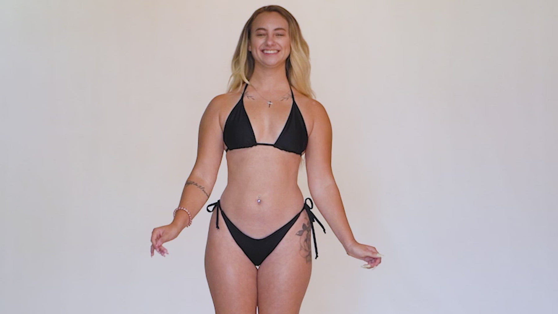 Classic triangle bikini top with ultra thin straps that ties around the neck and back. Comes in a variety of colors. Wear with Mini Tini Bottoms.